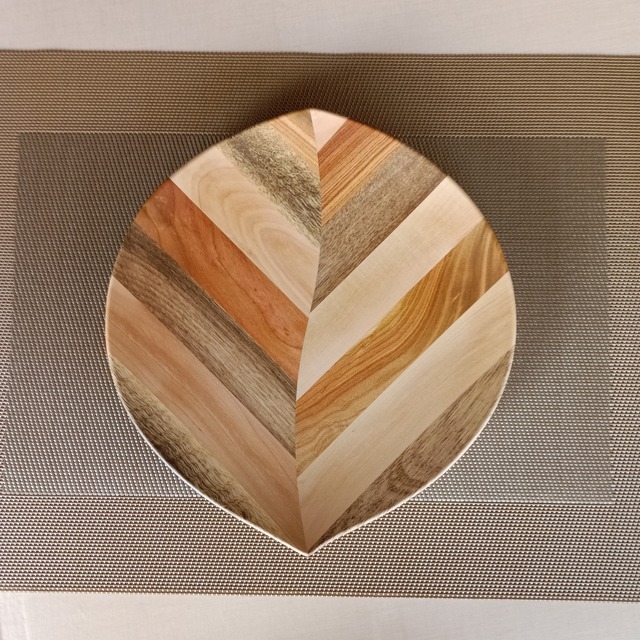 幅約22cm×24cm 高さ3cm 仕上げ:食器用ウレタン 一点ものですのでご注文頂いた場合は 画像と同じ木目の器をお送りいたします 彩り豊かな果樹の角材を模様のように合わせ、曲線にカットし、さらに貼り合わせて木の葉を模したお皿です。シンプルなデザインとナチュラルな風合いは和食や洋食、スイーツまでどんな料理も引き立てます。 食器用の安全な塗料(ウレタン)を 塗り重ねていますので油・ソースなどの調味料や 熱湯が染み込むことはほとんどありません。 *表面を傷つけるスチールたわし、クレンザーなどのご使用はご遠慮ください。 *電子レンジのご使用はご遠慮ください。 *食器洗い機・食器乾燥機のご使用はお控えください。 *カレーなどを長い時間放置すると、染まることがありますのでご注意ください。 木の器は長くご愛用いただきますと、丁寧にお取り扱いいただいても徐々に塗料がはがれてまいります。予めご了承ください。