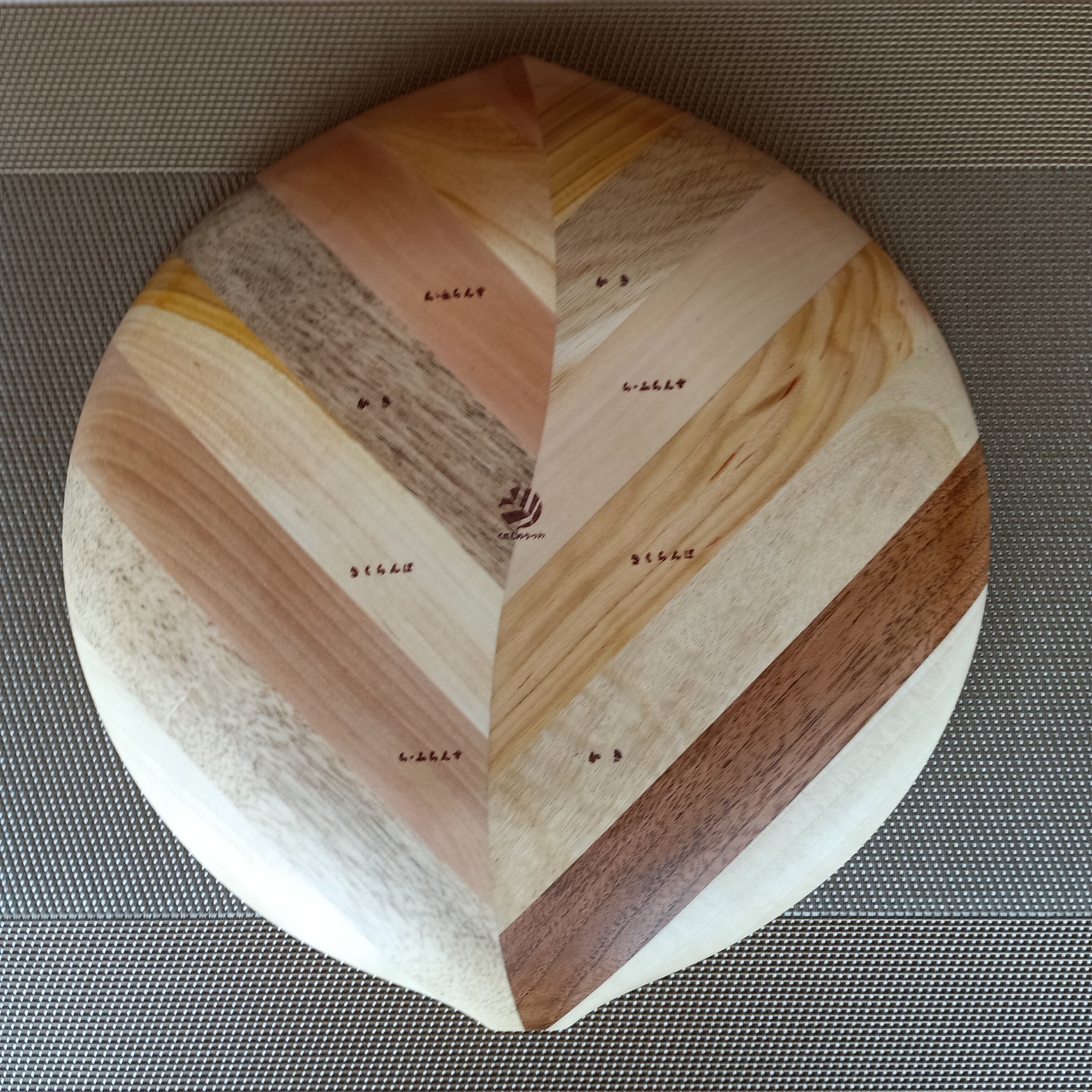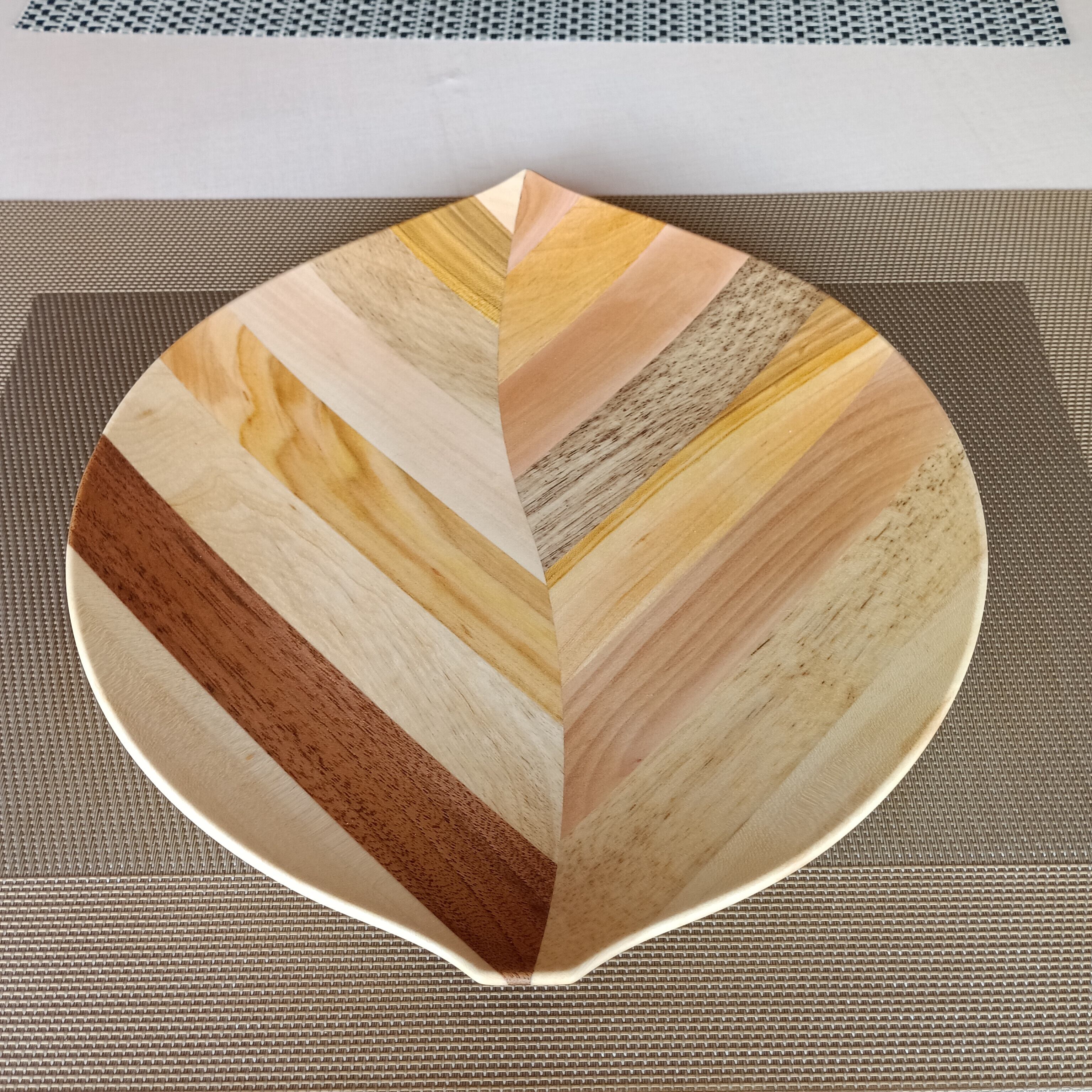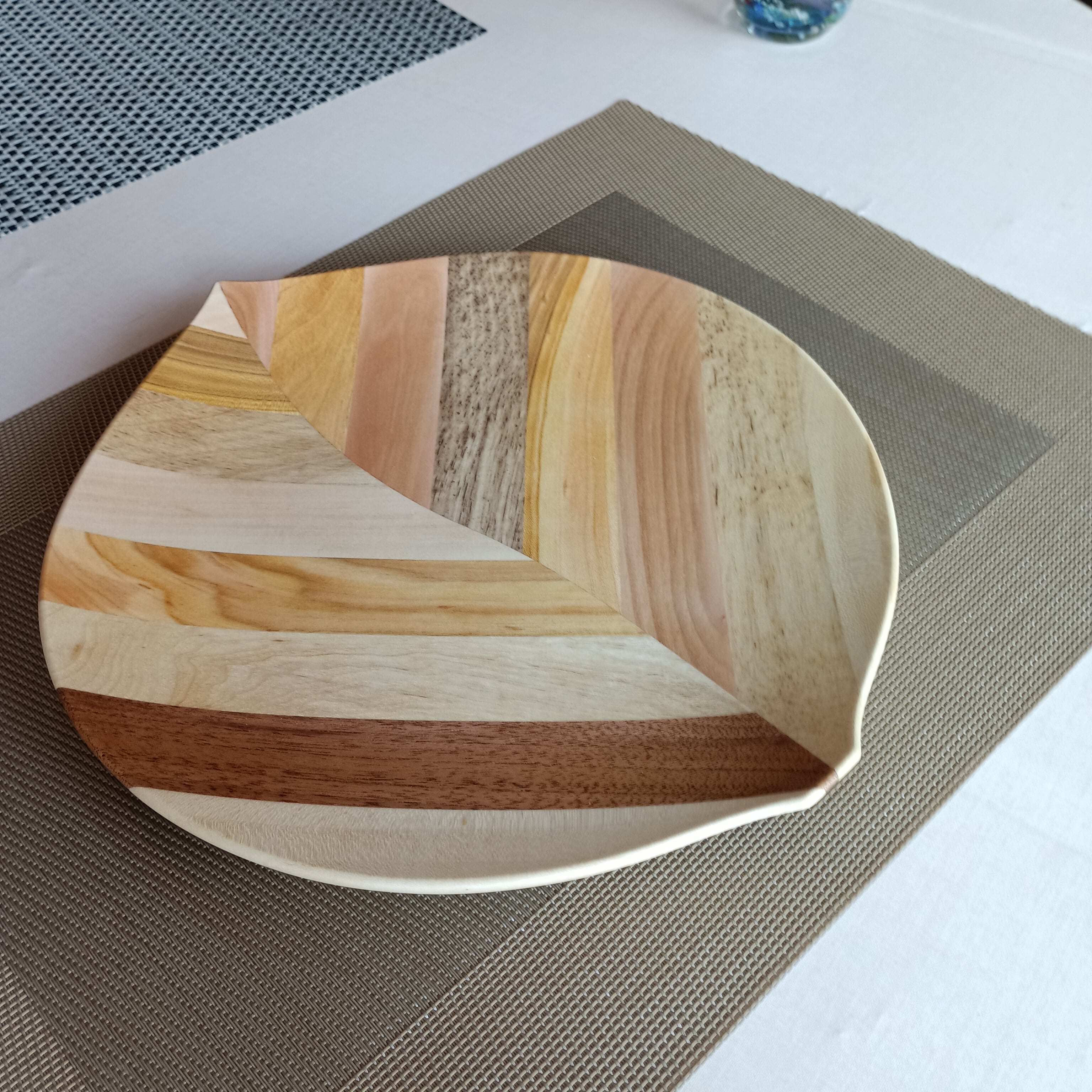 彩り豊かな果樹の角材を模様のように合わせ、曲線にカットし、さらに貼り合わせて木の葉を模したお皿です。シンプルなデザインとナチュラルな風合いは和食や洋食、スイーツまでどんな料理も引き立てます。