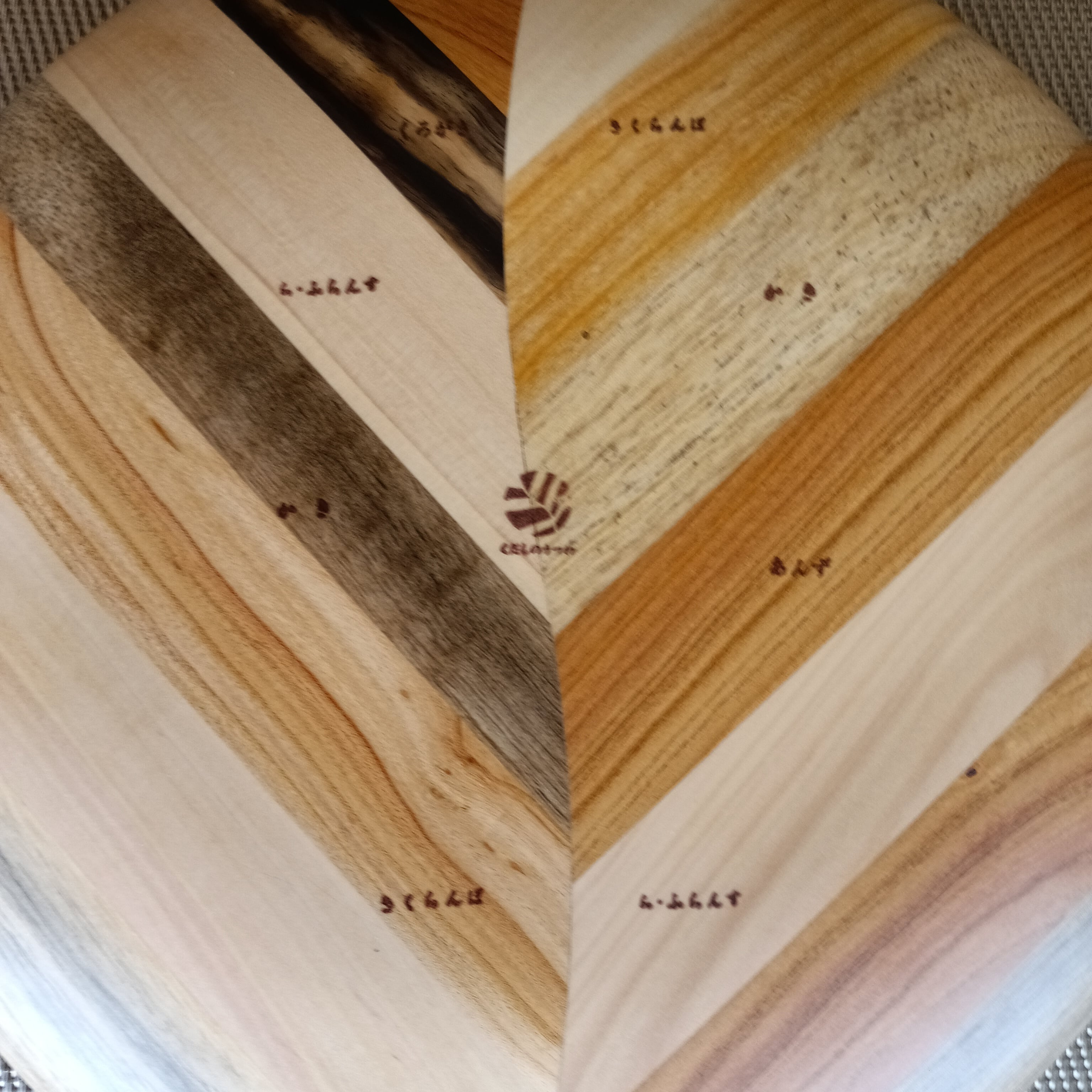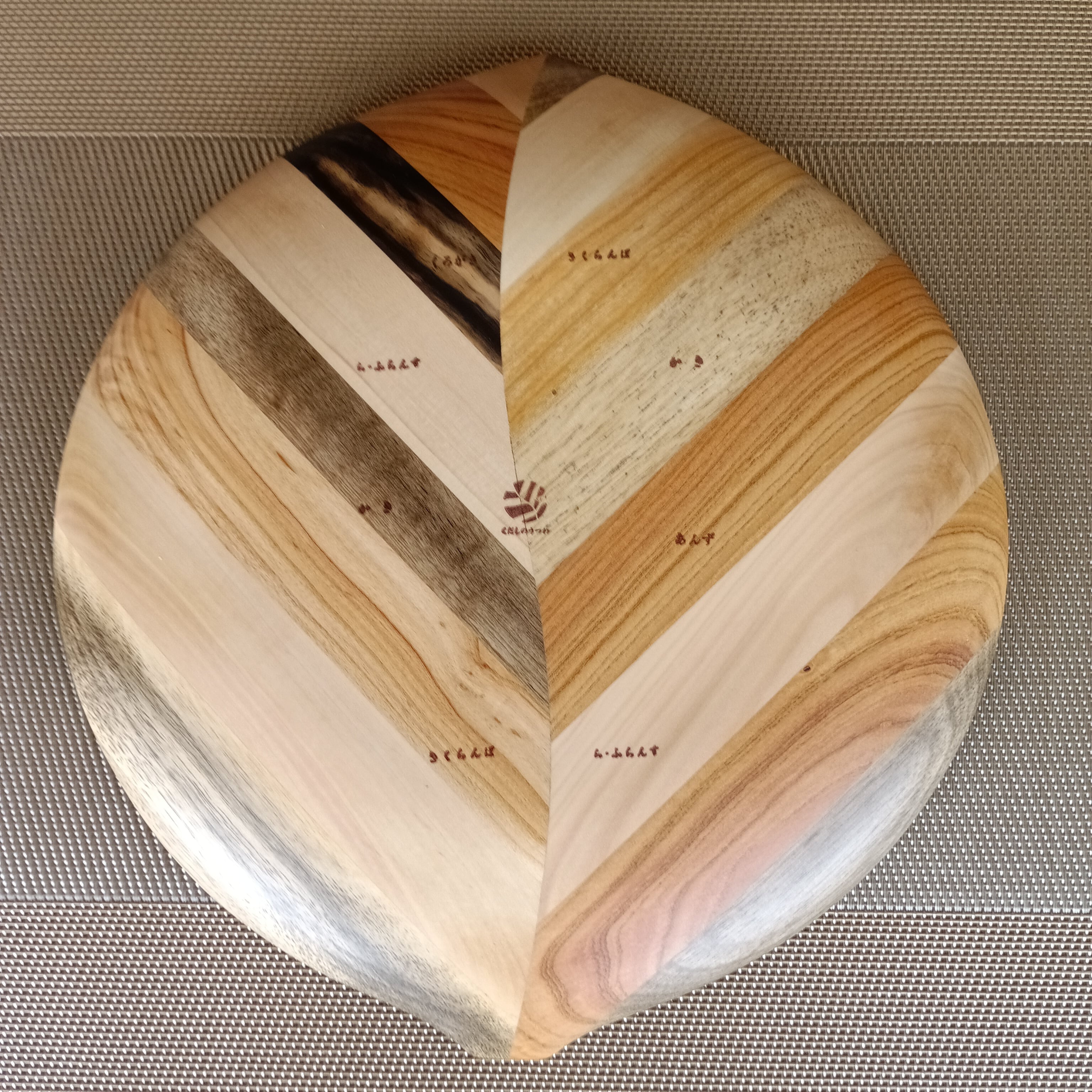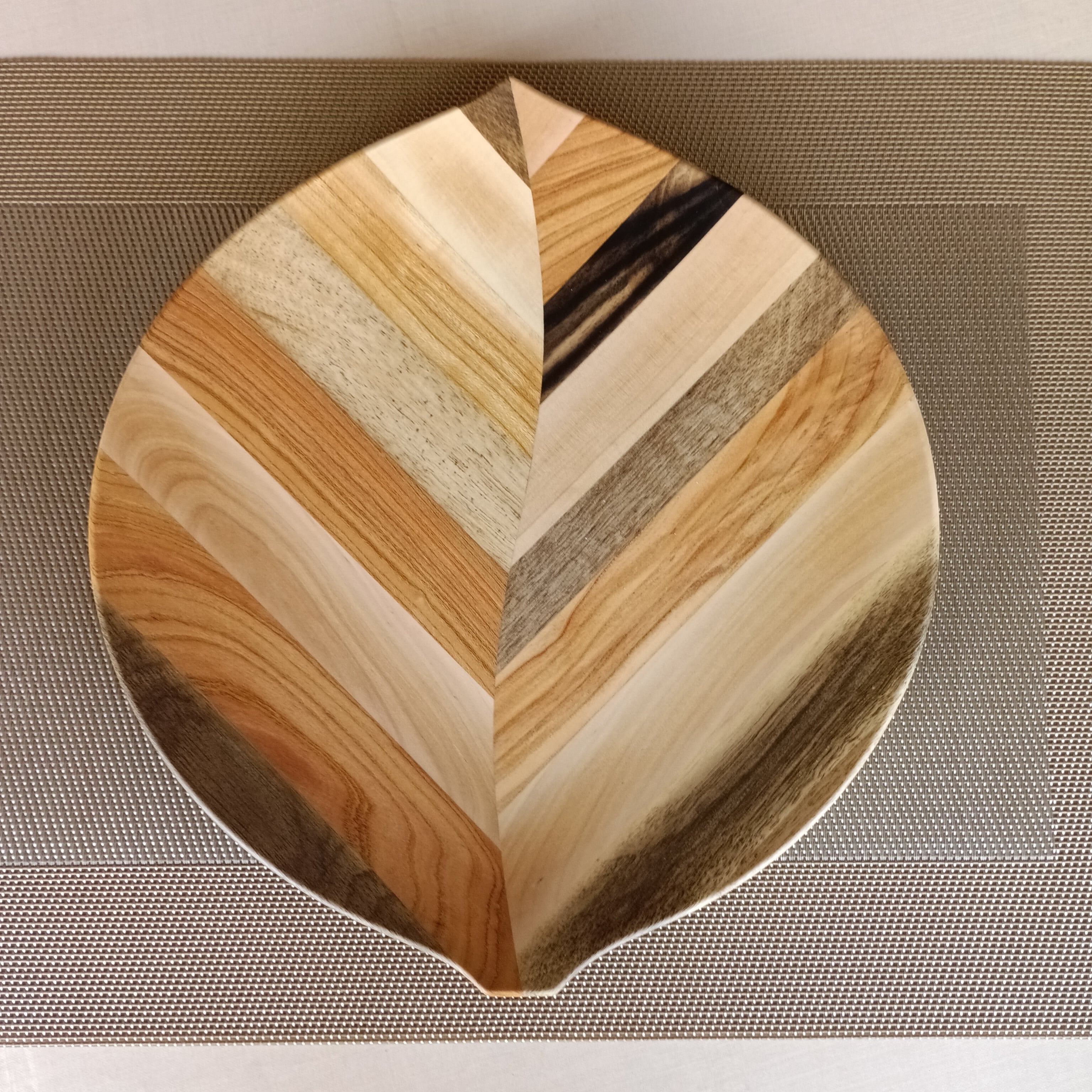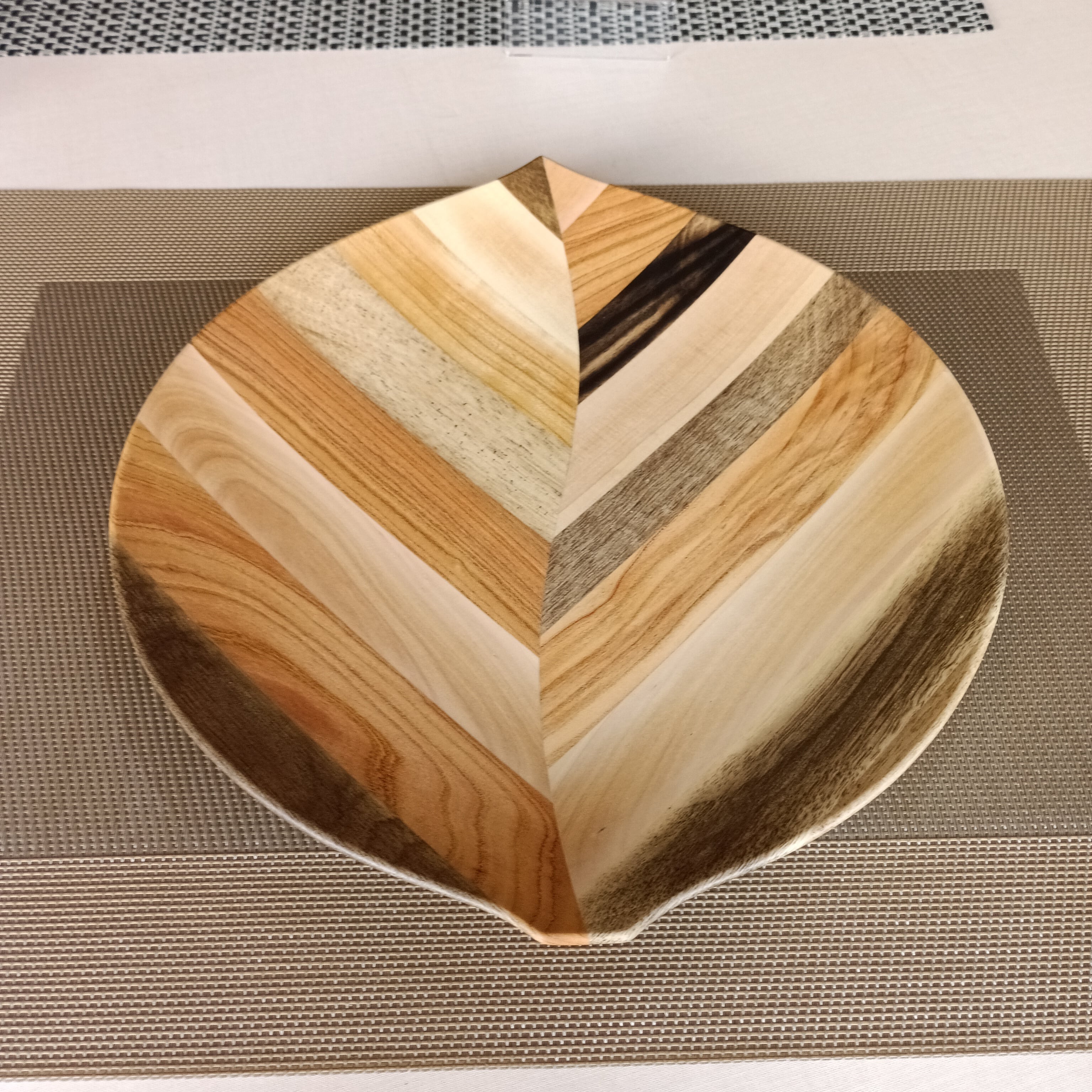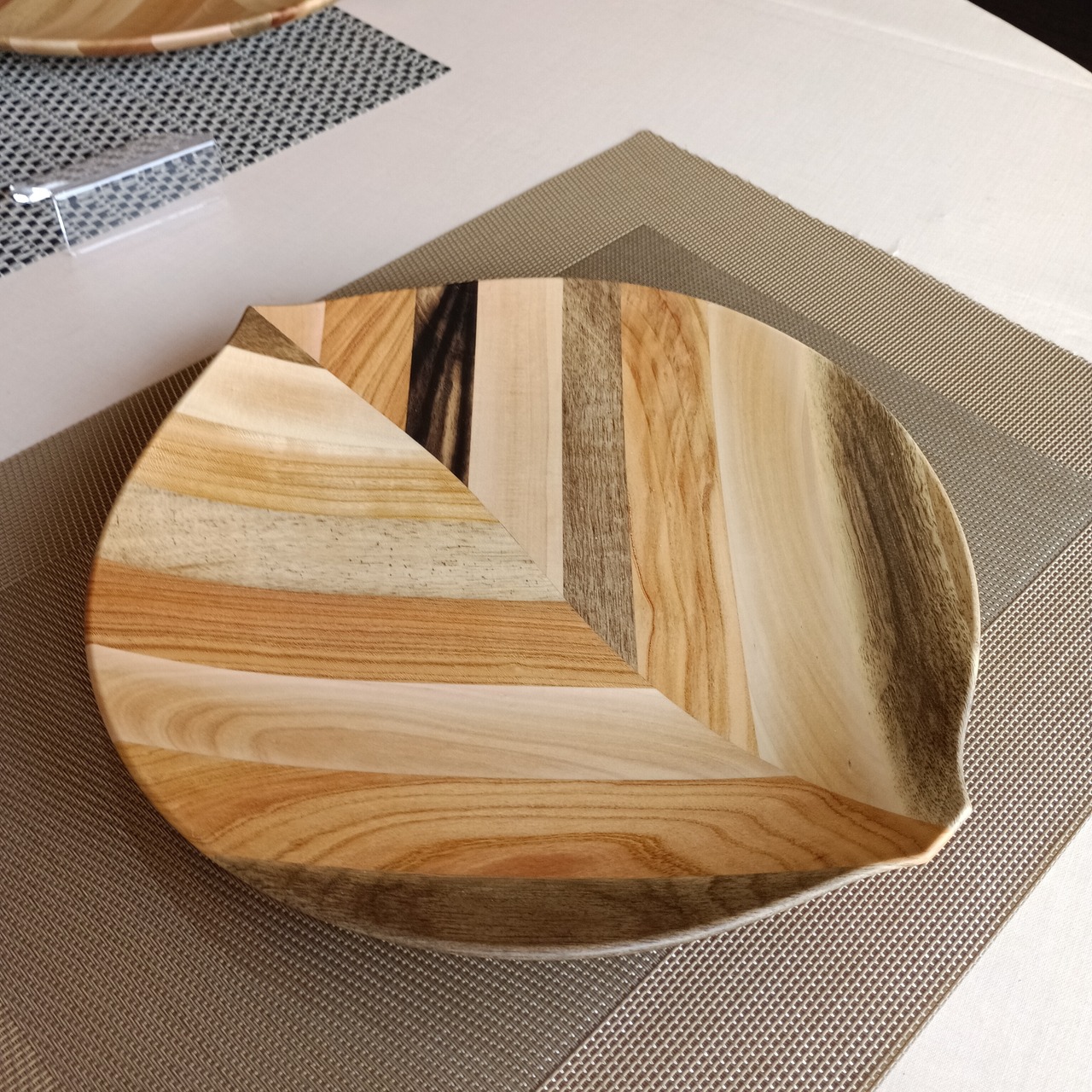 彩り豊かな果樹の角材を模様のように合わせ、曲線にカットし、さらに貼り合わせて木の葉を模したお皿です。シンプルなデザインとナチュラルな風合いは和食や洋食、スイーツまでどんな料理も引き立てます。
