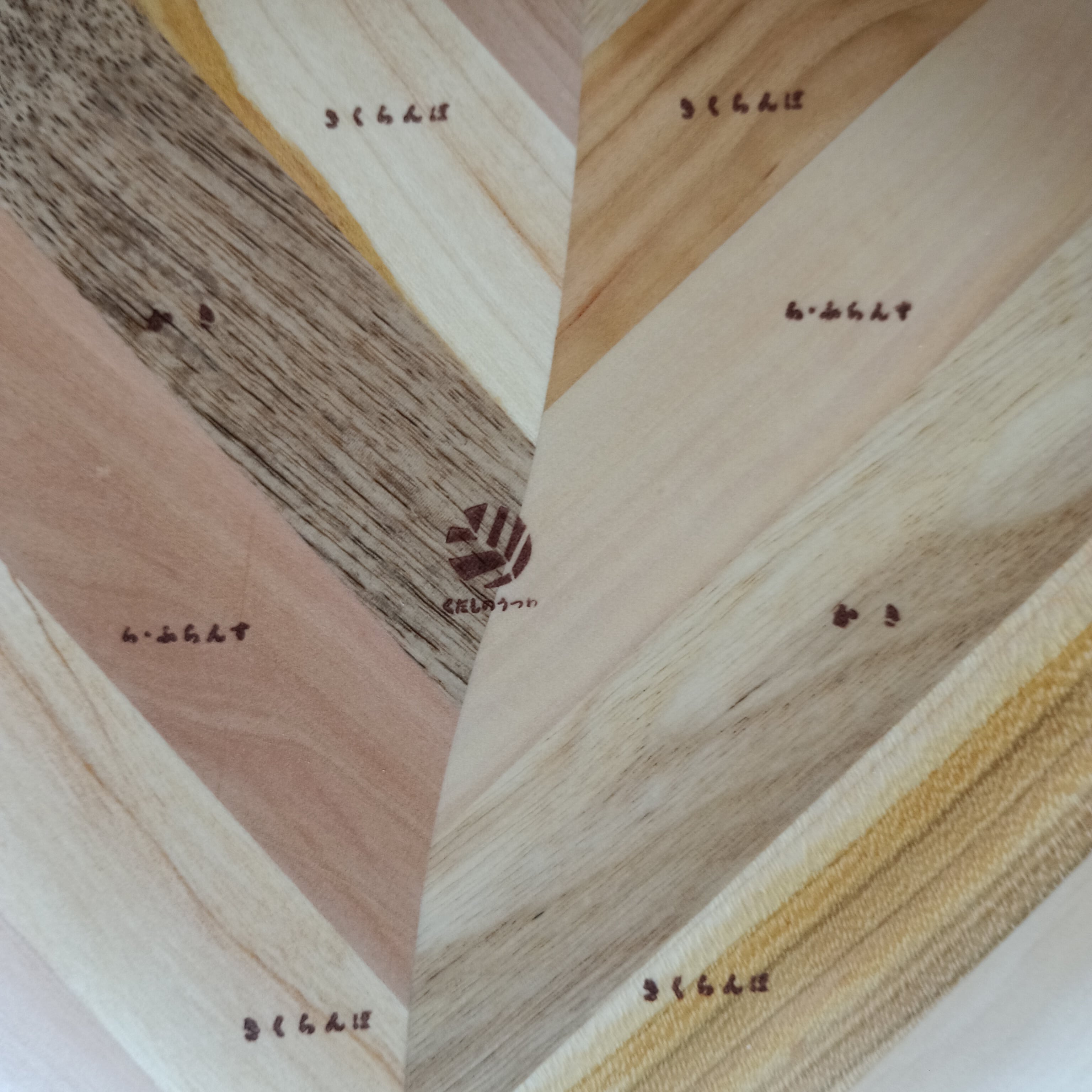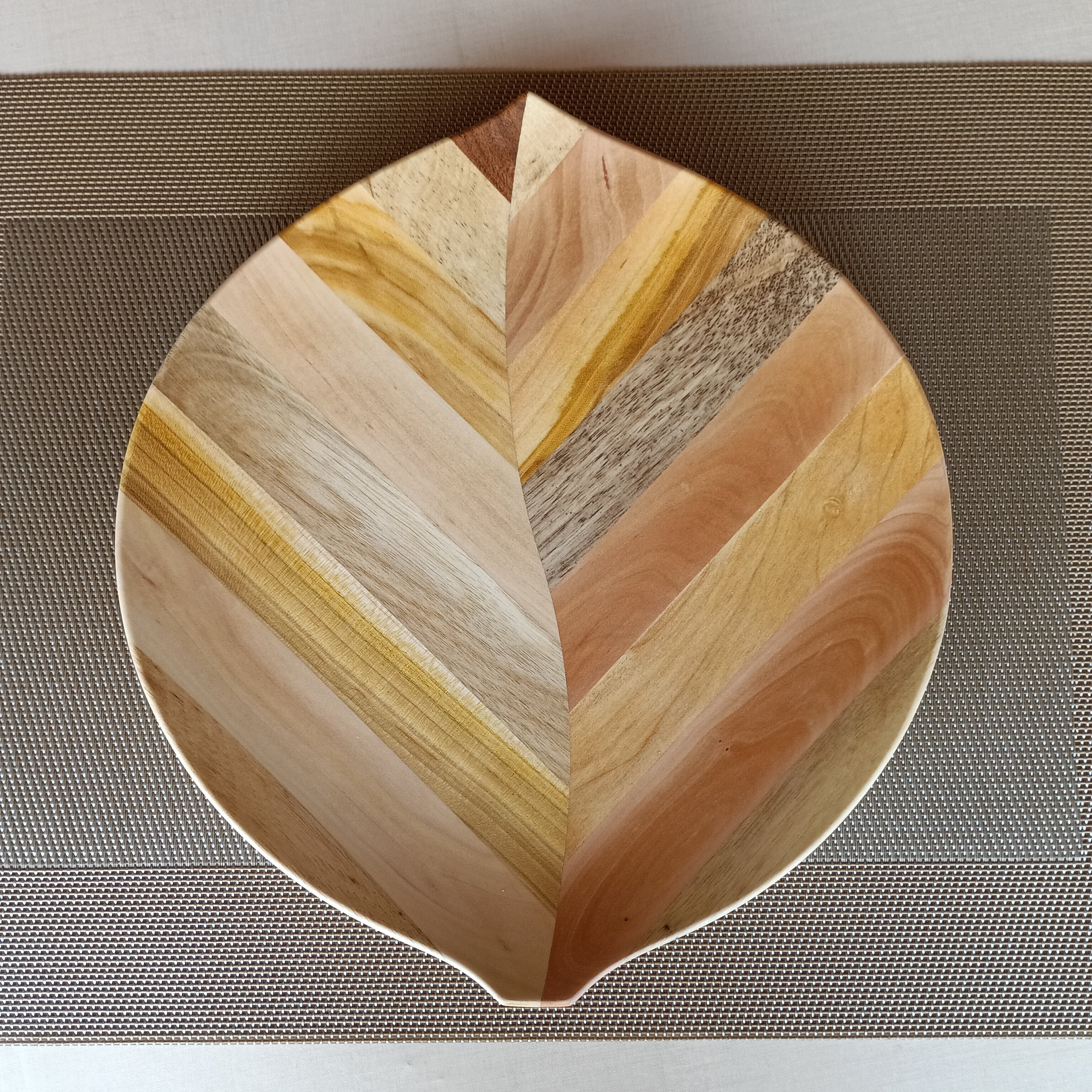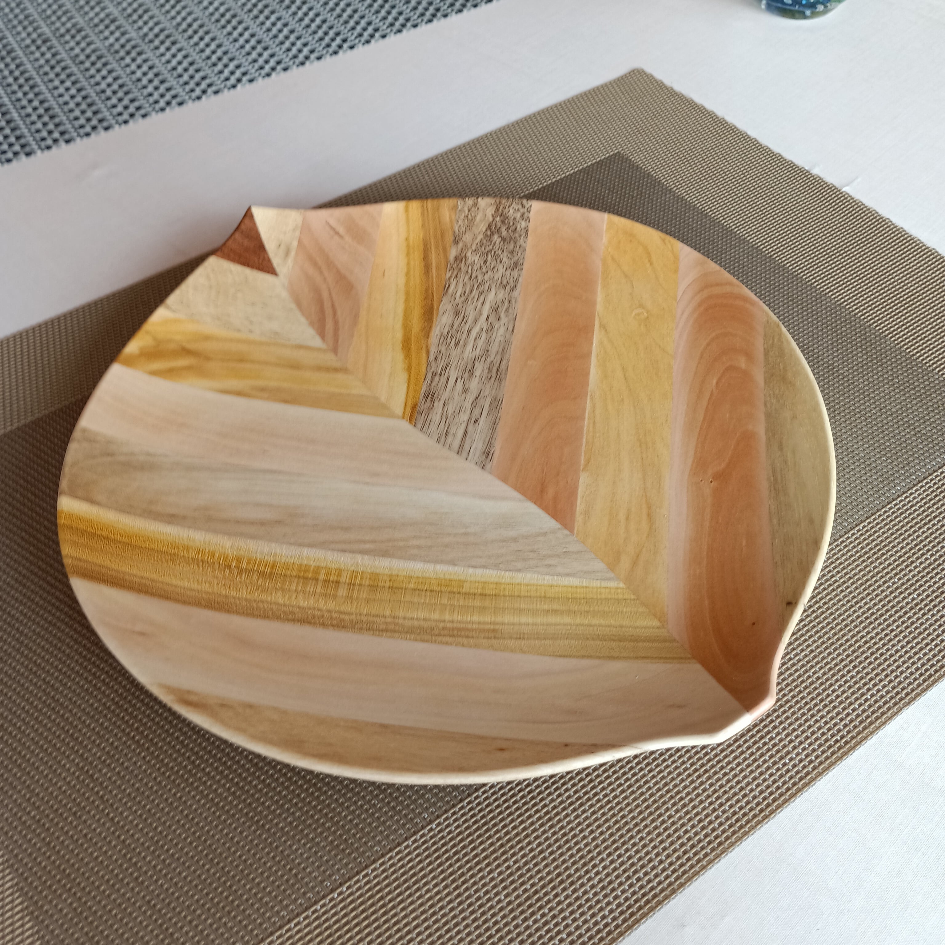 彩り豊かな果樹の角材を模様のように合わせ、曲線にカットし、さらに貼り合わせて木の葉を模したお皿です。シンプルなデザインとナチュラルな風合いは和食や洋食、スイーツまでどんな料理も引き立てます。