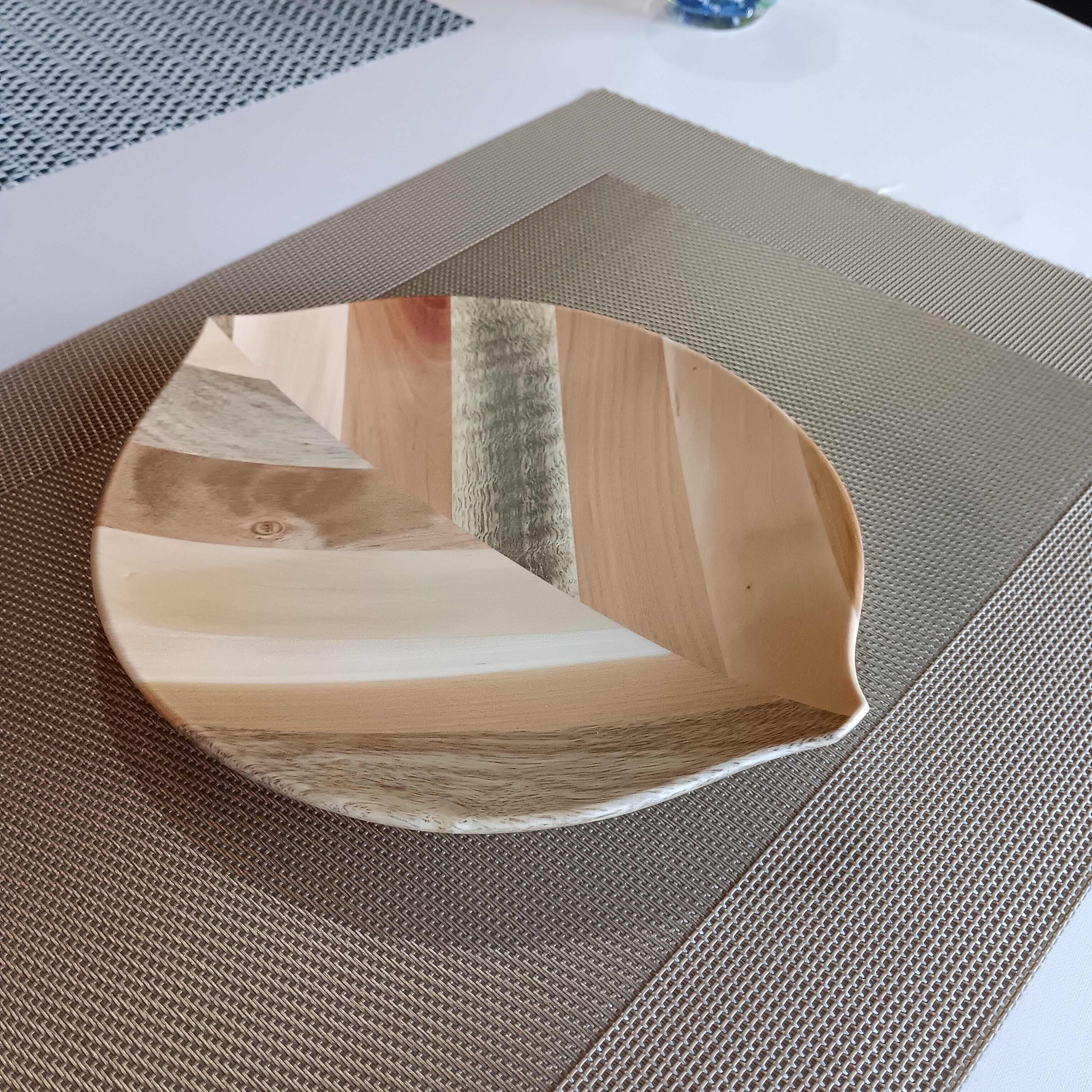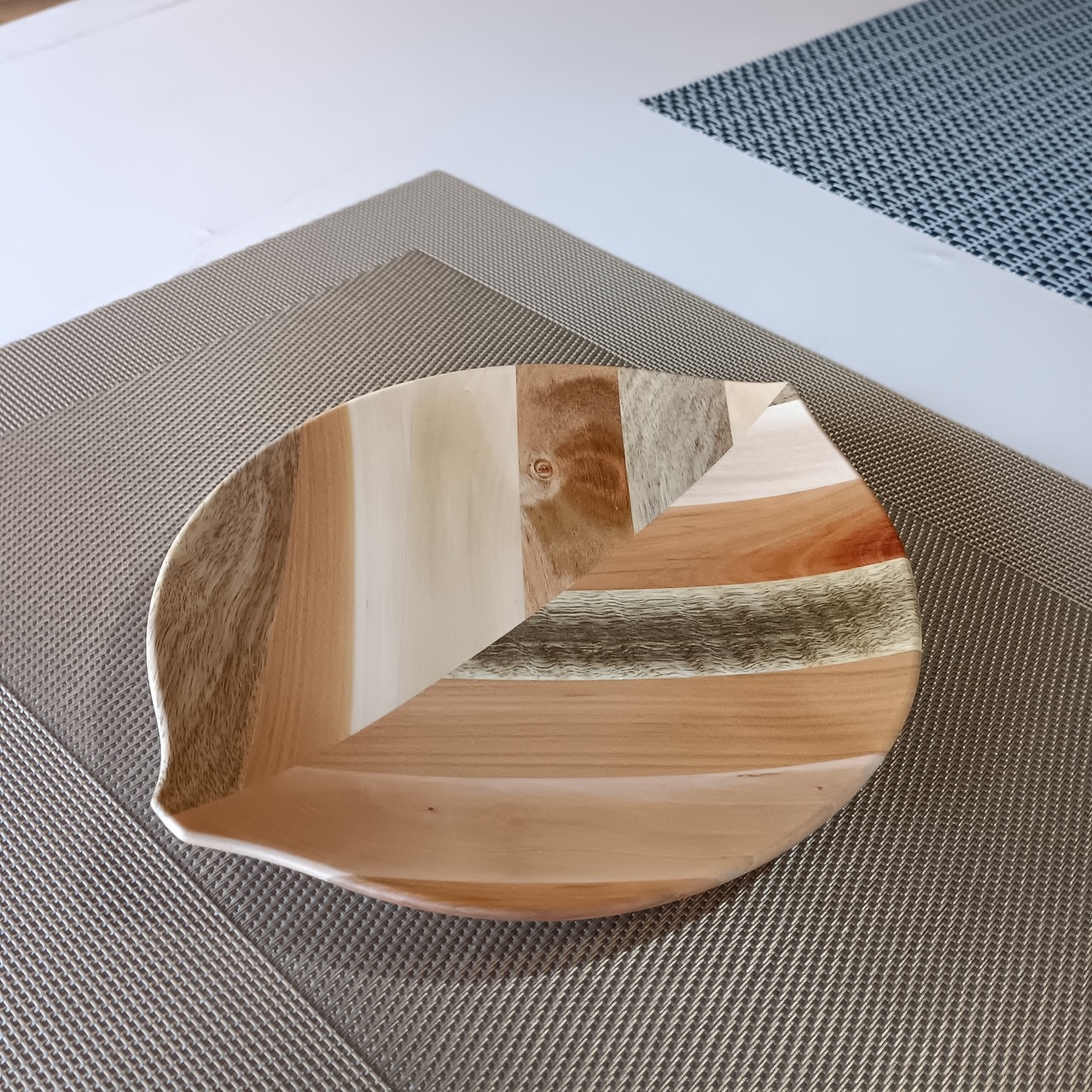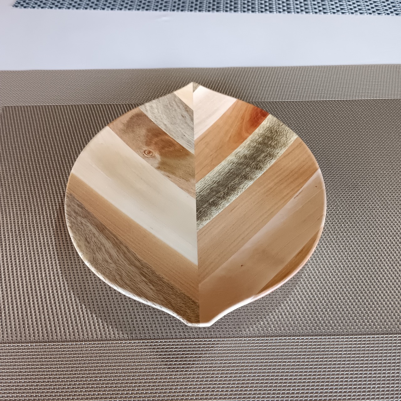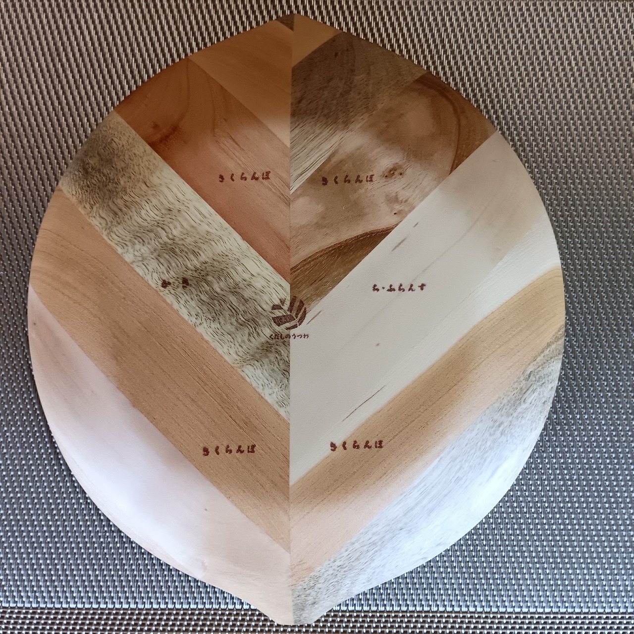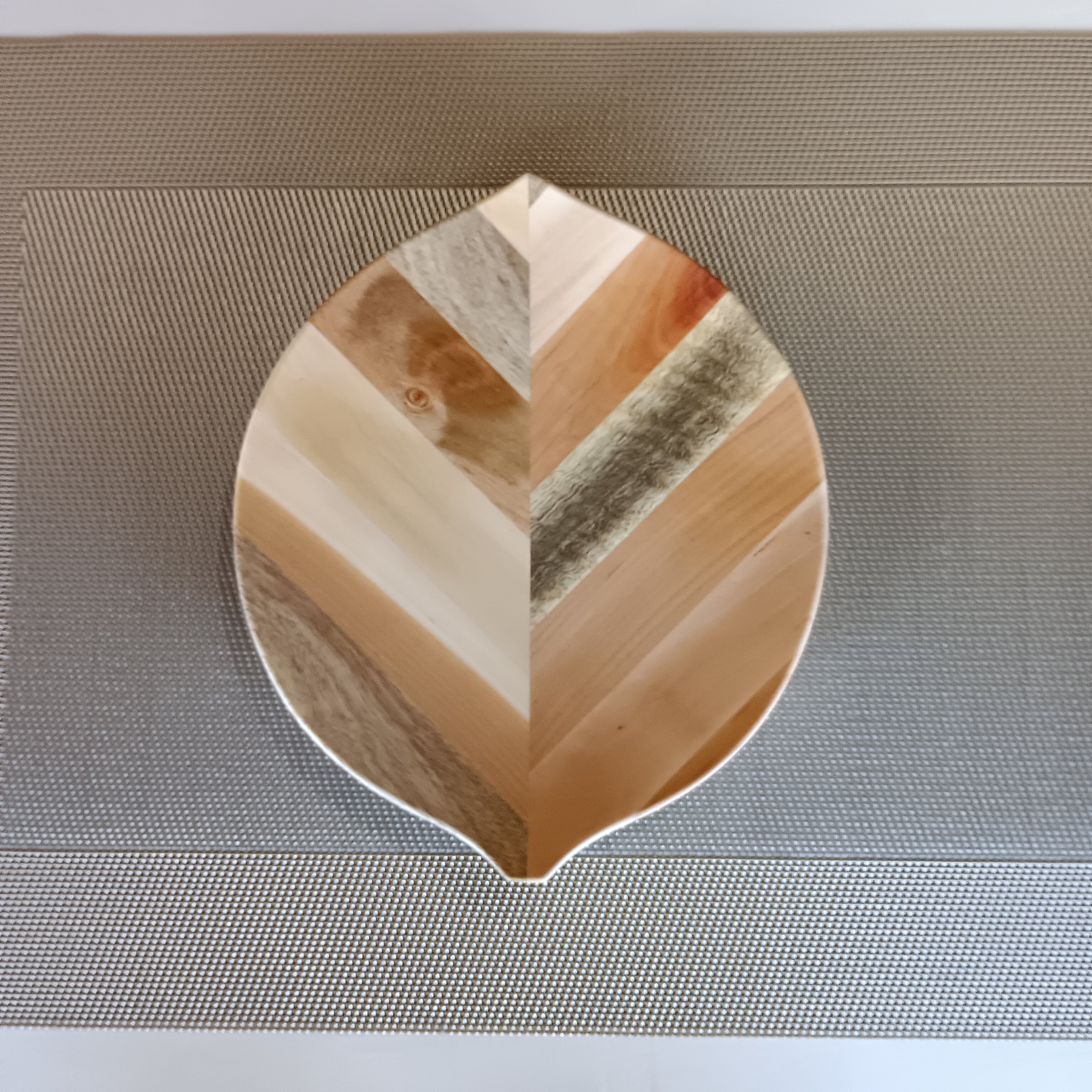 彩り豊かな果樹の角材を模様のように合わせ、さらに貼り合わせて木の葉を模したお皿です。シンプルなデザインとナチュラルな風合いは和食や洋食、スイーツまでどんな料理も引き立てます。