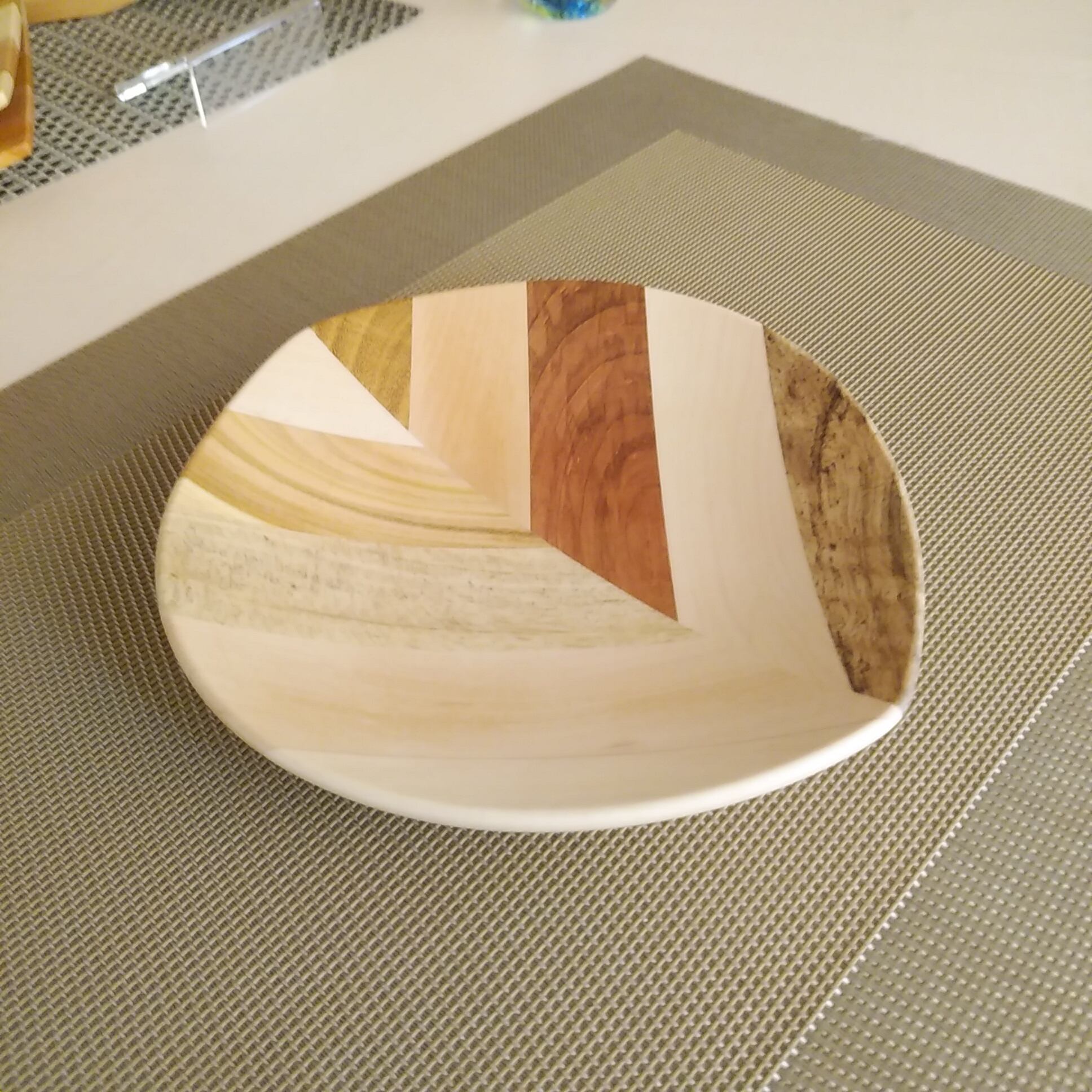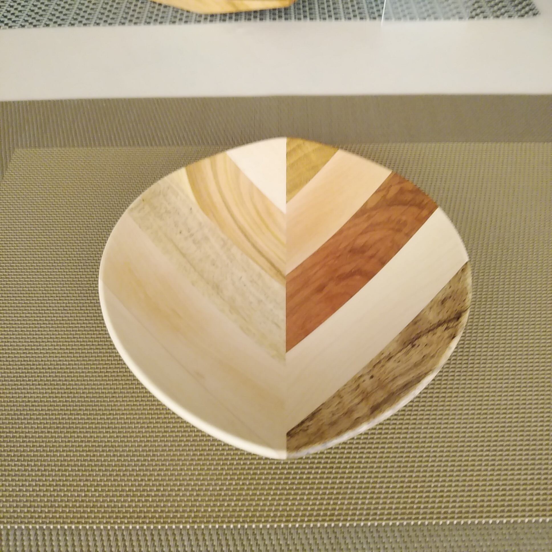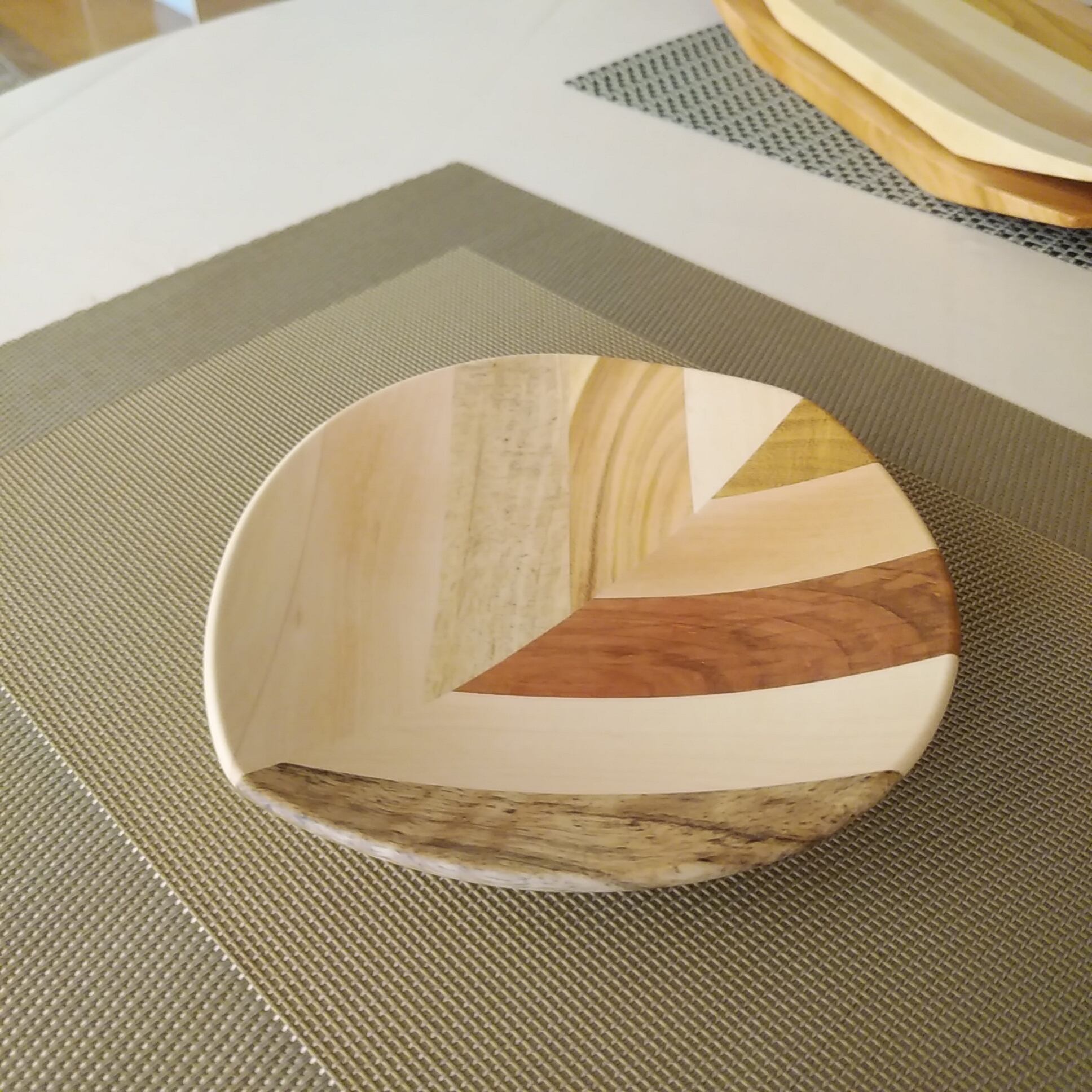 彩り豊かな果樹の角材を模様のように合わせ、曲線にカットし、さらに貼り合わせて木の葉を模したお皿です。シンプルなデザインとナチュラルな風合いは和食や洋食、スイーツまでどんな料理も引き立てます。