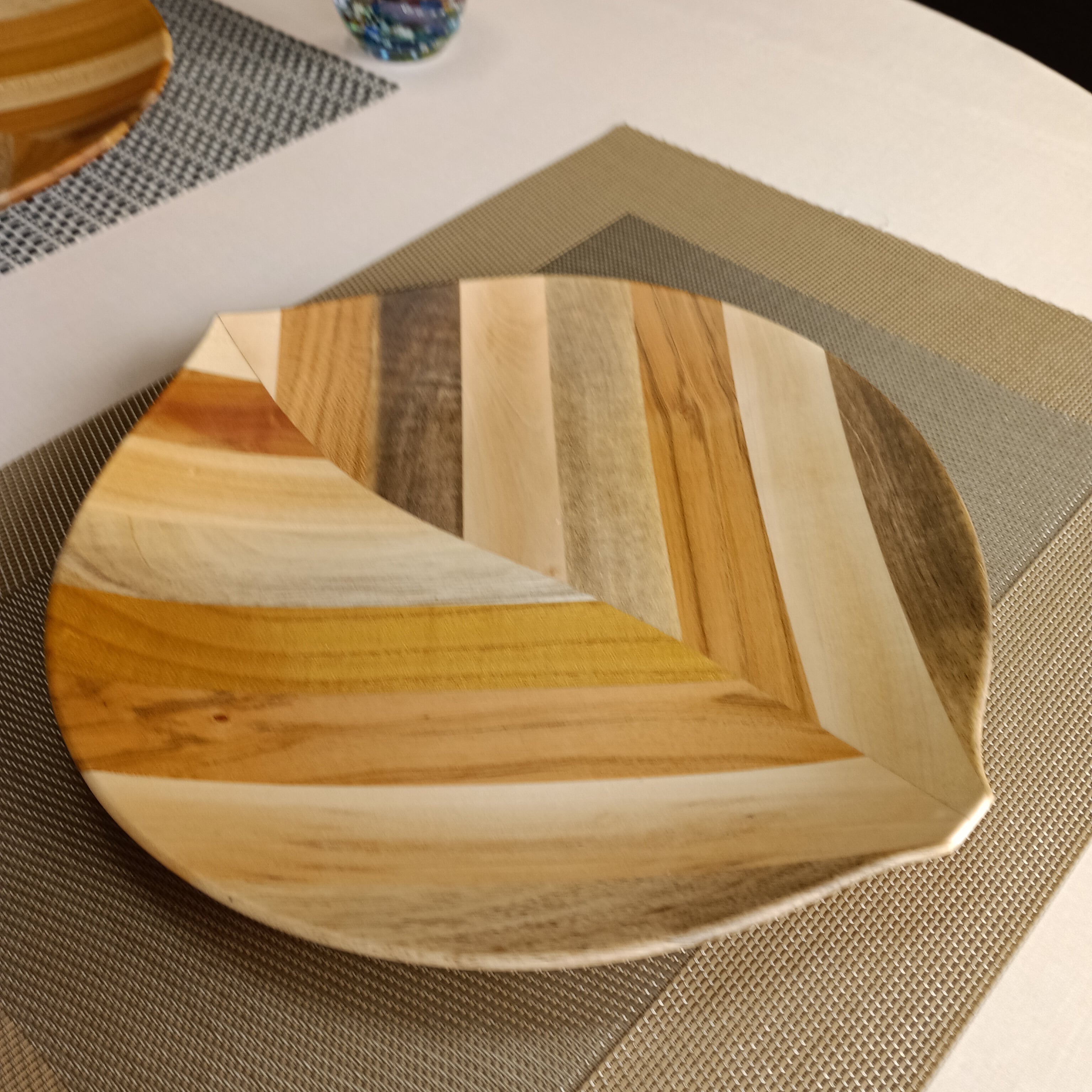 彩り豊かな果樹の角材を模様のように合わせ、曲線にカットし、さらに貼り合わせて木の葉を模したお皿です。シンプルなデザインとナチュラルな風合いは和食や洋食、スイーツまでどんな料理も引き立てます。